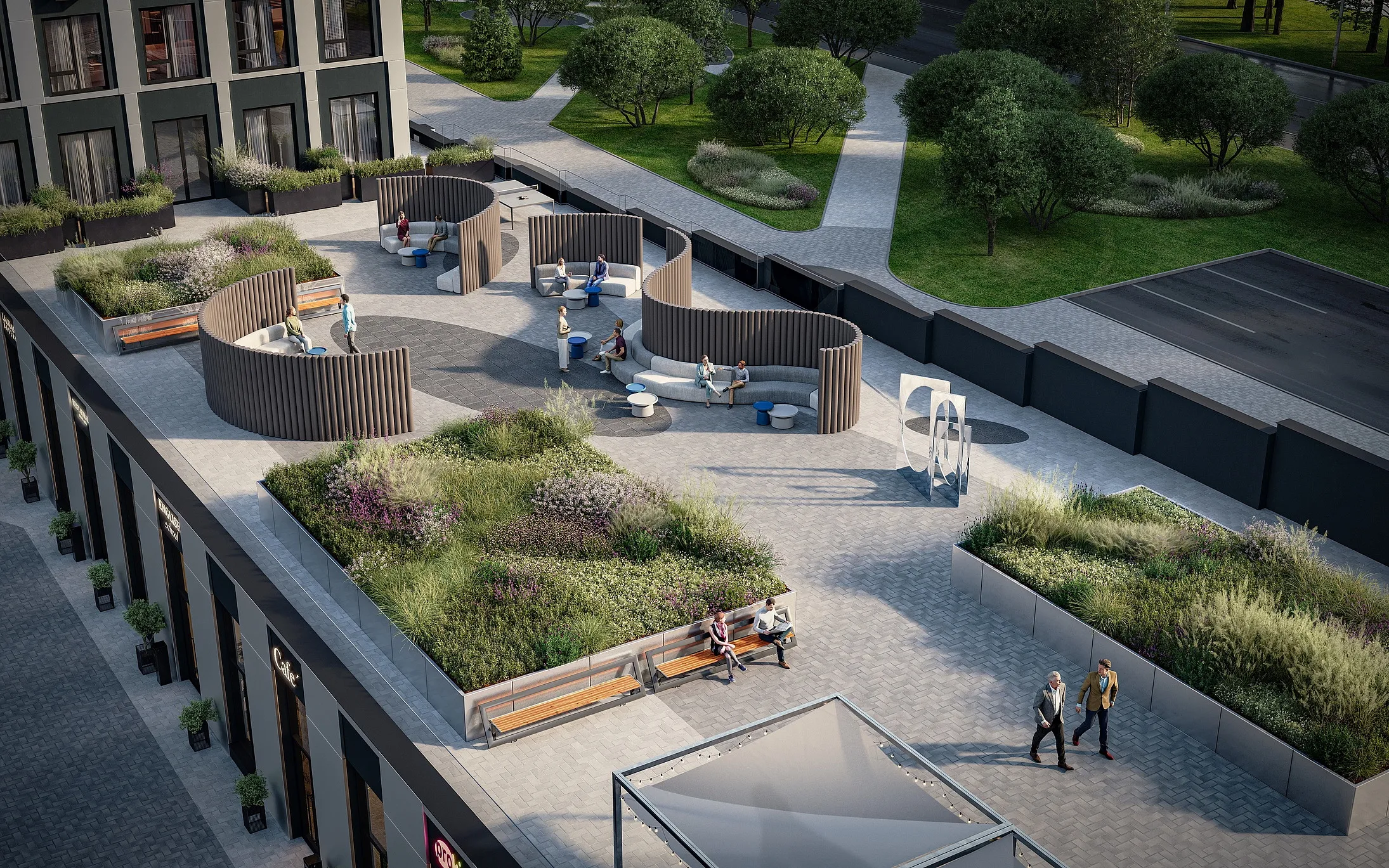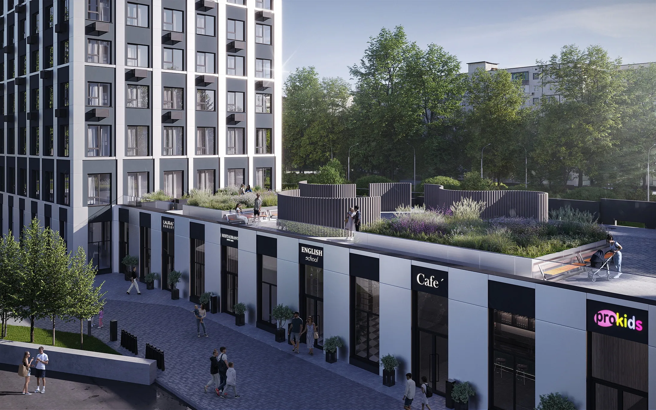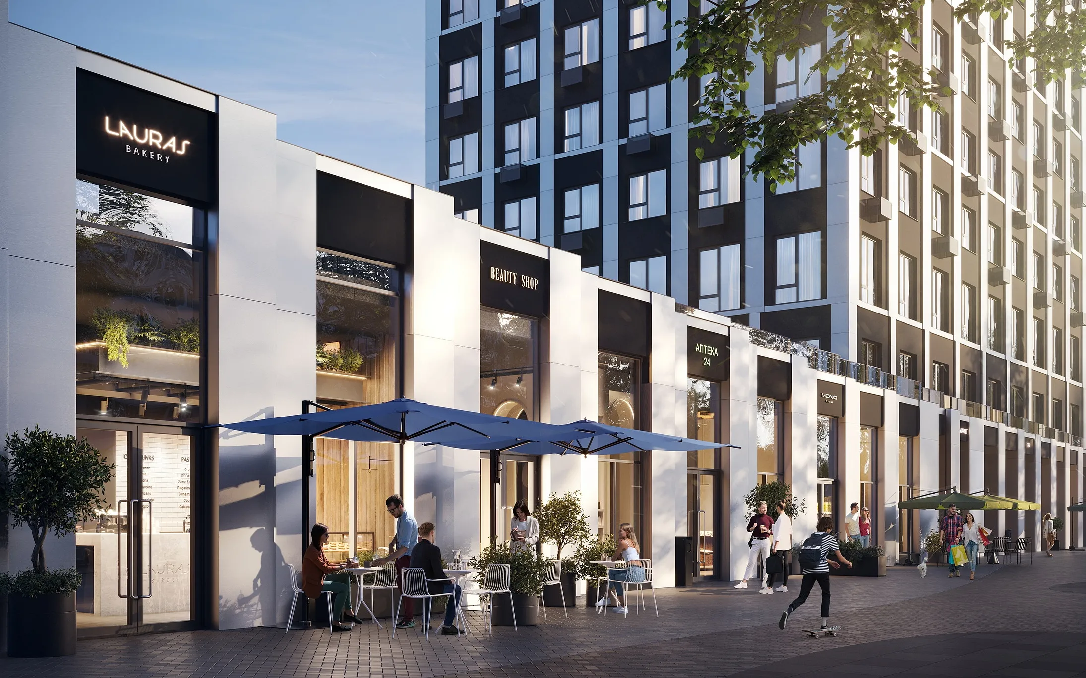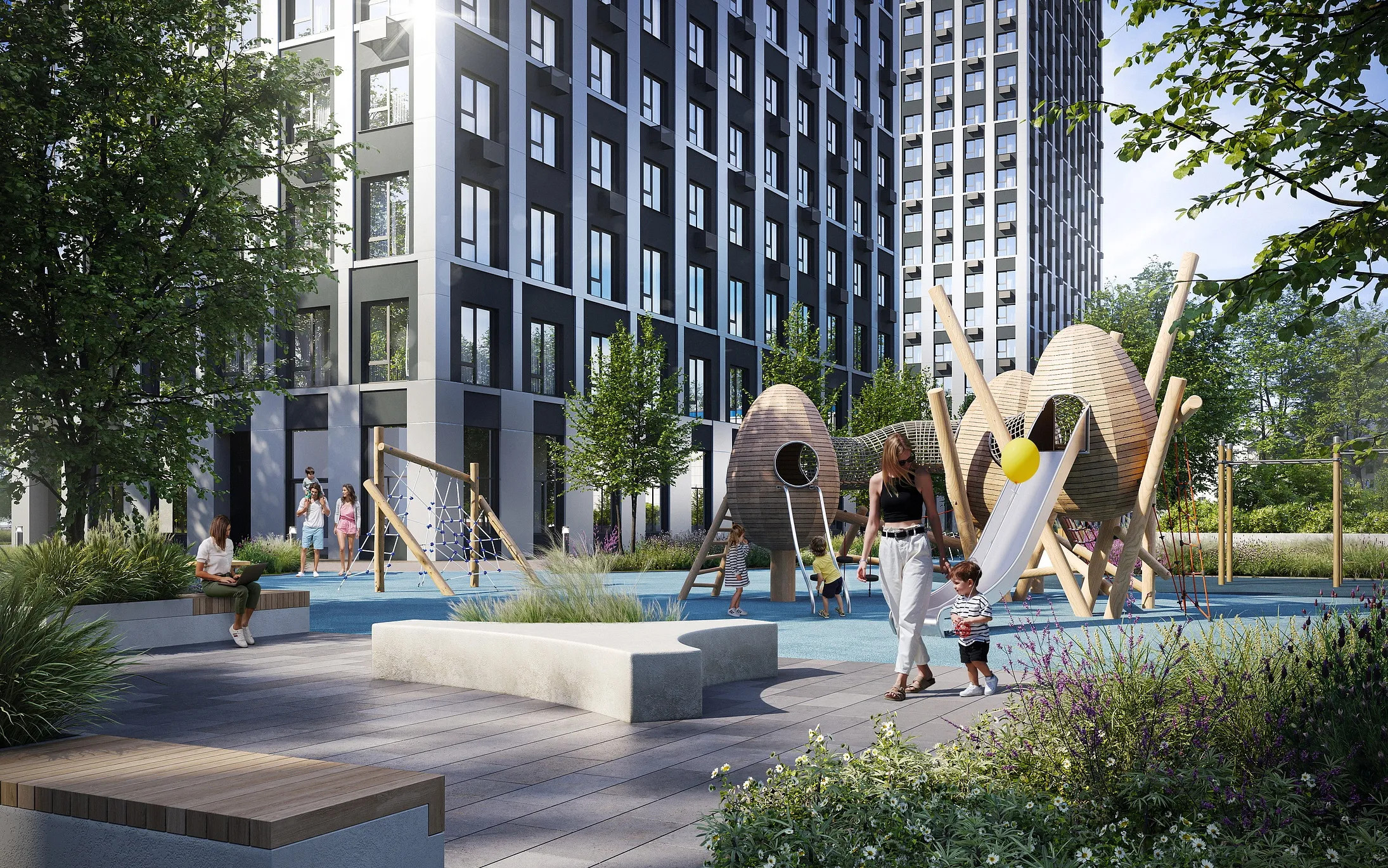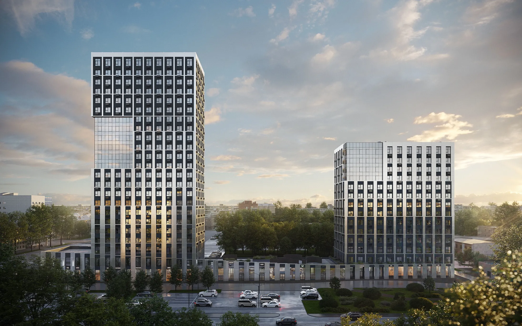 Стальные фасады домов разбивают два больших стеклянных модуля. Они отражают небо и создают иллюзию невесомой матрицы. Это окна городского масштаба в квартирах, где нет давящих стен, а есть только свобода и ясное видение будущего.