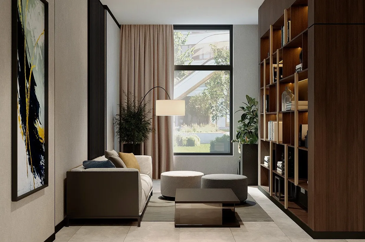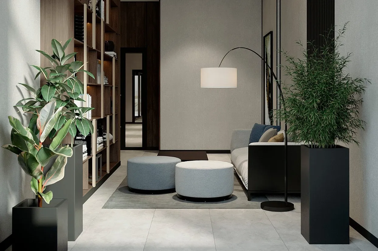 В общественных гостиных мы разместим мягкую мебель, чтобы вы могли комфортно поговорить с соседом, подождать курьера, встретиться с дизайнером или руководителем ремонтной бригады. Здесь будут установлены торшеры и растения. А теплый свет добавит уюта этим зонам.