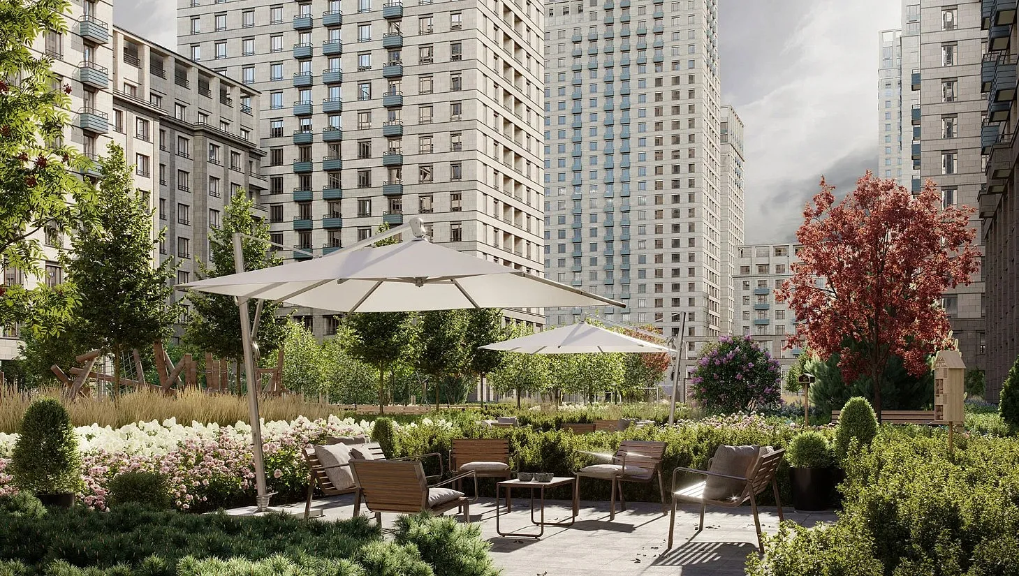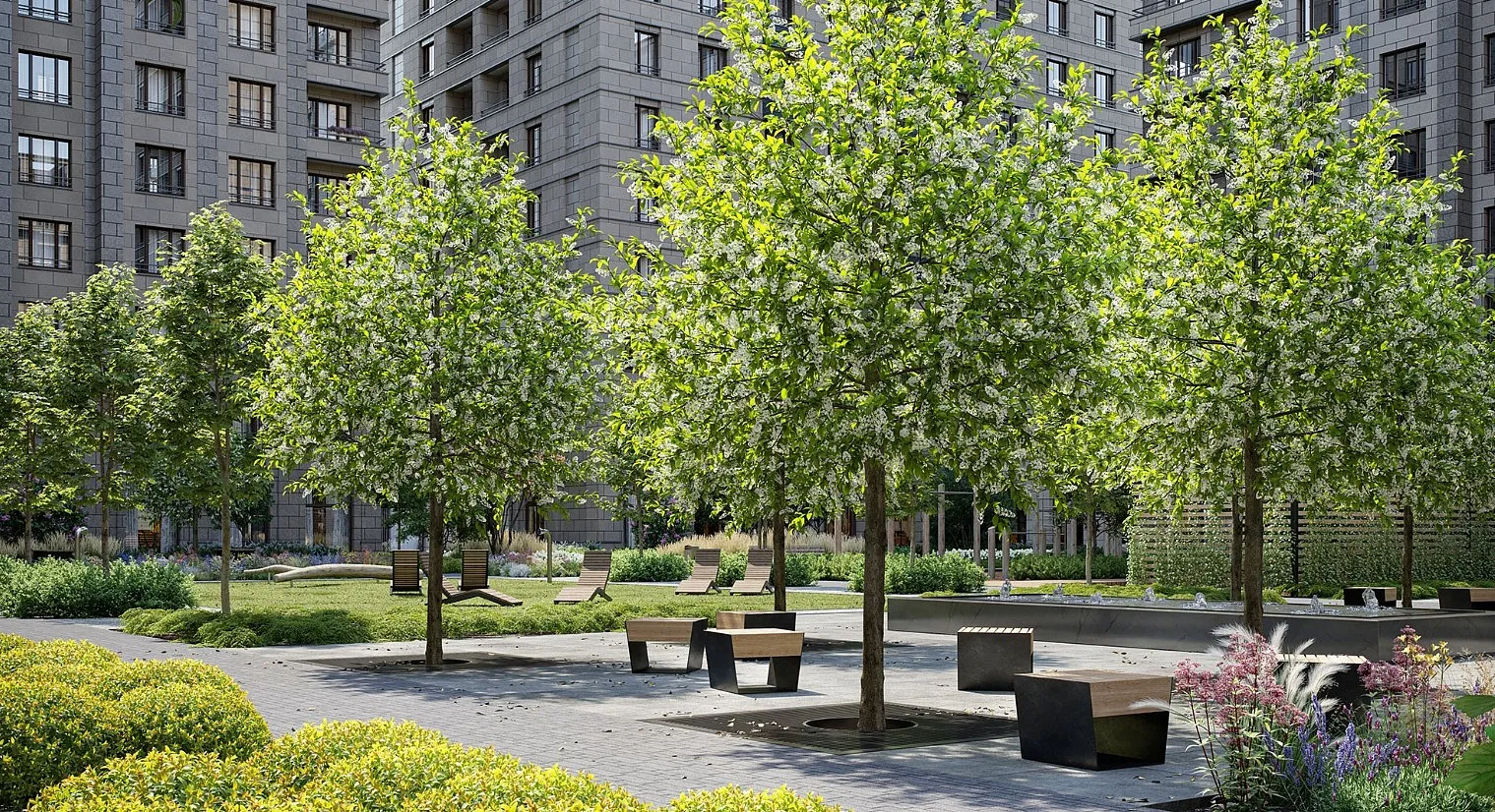70% территории дворов покрыты зеленью. Все растения подбираются по календарю цветения. Продумывая палитру, ландшафтные архитекторы обращают внимание не только на листья и бутоны, но и на кору и стебли. Поэтому дворы выглядят привлекательно в любое время года.