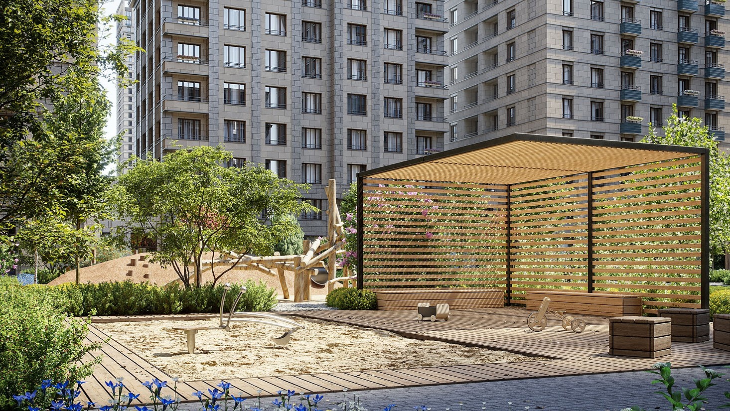 Большие зелёные дворы закрыты для машин и разделены на функциональные зоны - для тихого отдыха, пикников, игр, занятий спортом. Всё оборудование на детских площадках мы делаем из дерева — зимой оно не промерзает, а летом не накаляется на солнце.