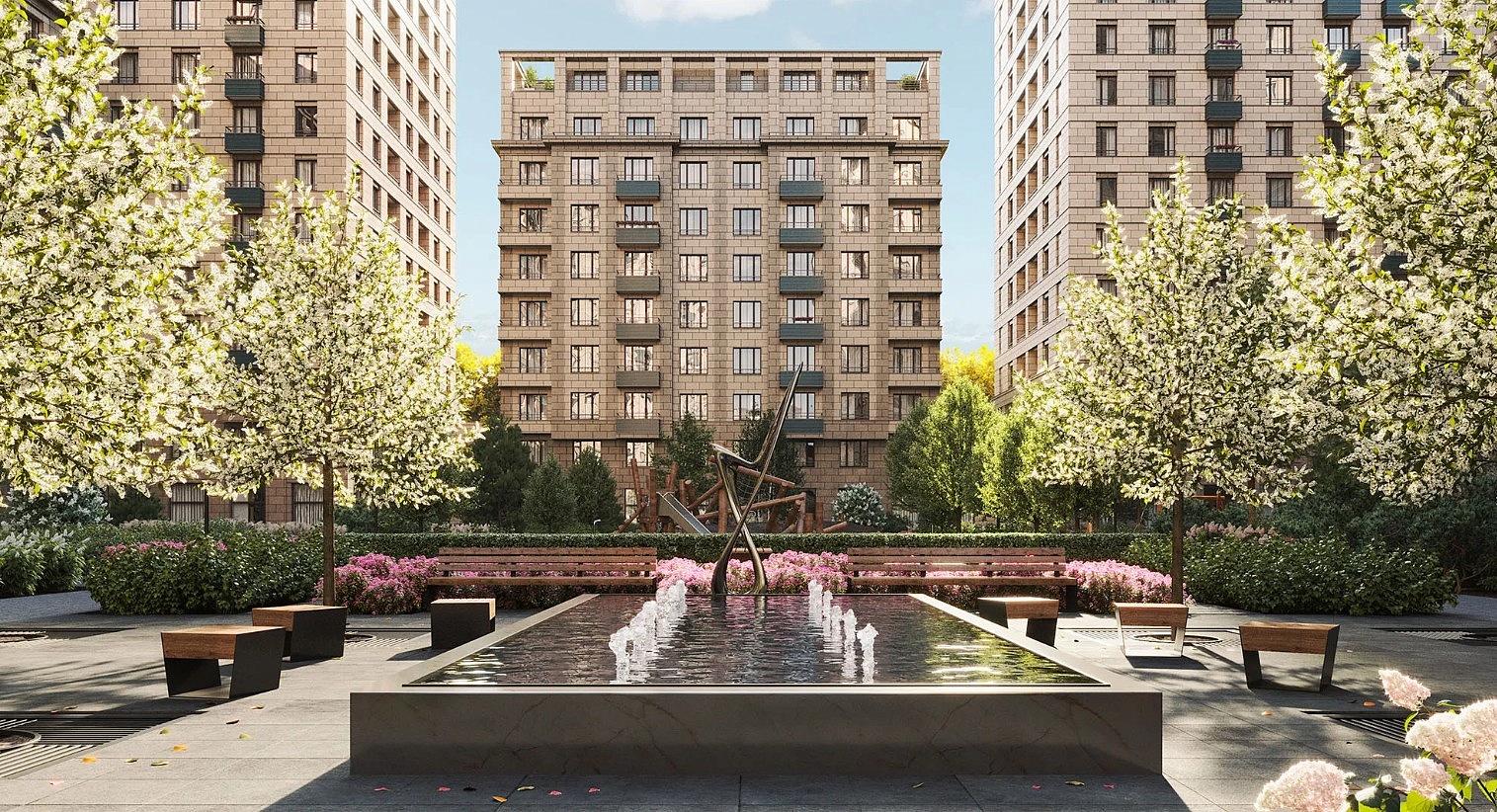 Фасады домов облицованы керамогранитом с фактурой камня и отсылают к архитектуре XVIII-XIX веков. Тёмный оттенок и крупная нарезка нижней части добавят первым этажам основательности. Кропотливо проработанная архитектура сделает здания элегантными и привлекающими внимание.
