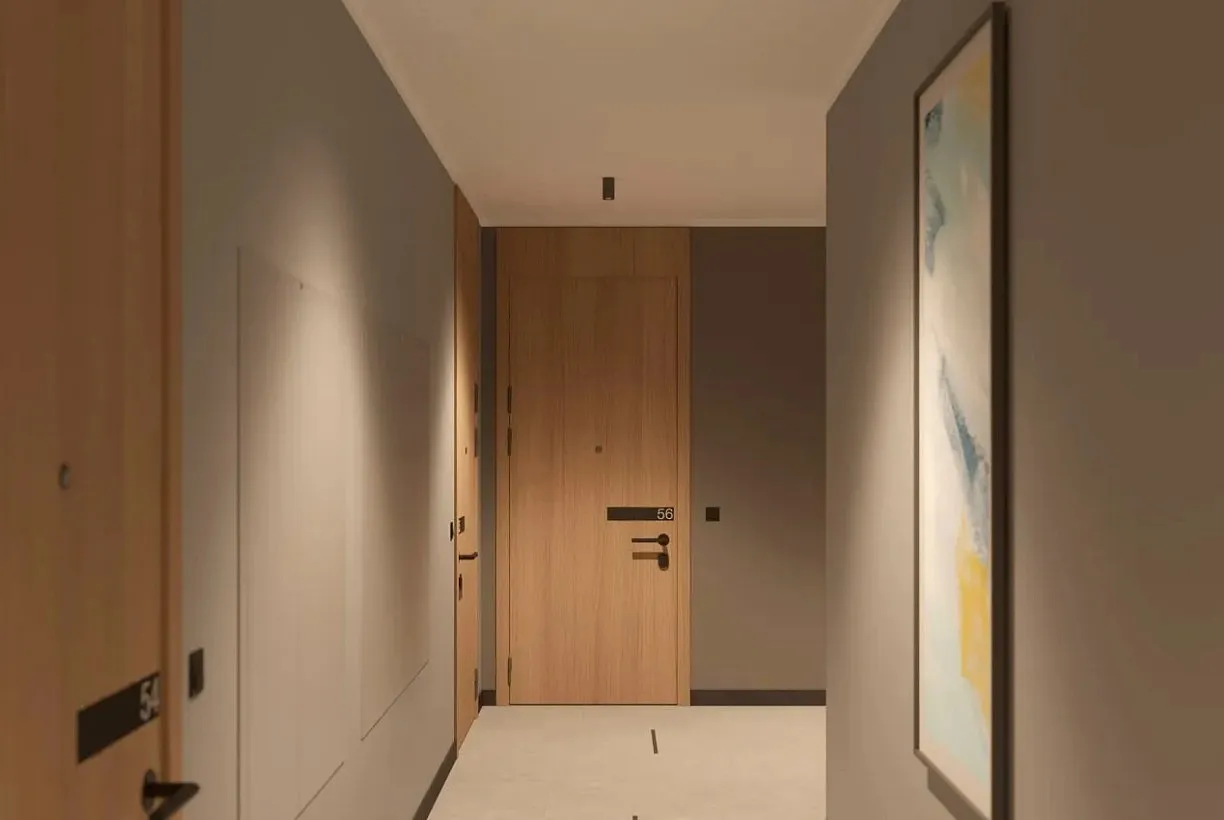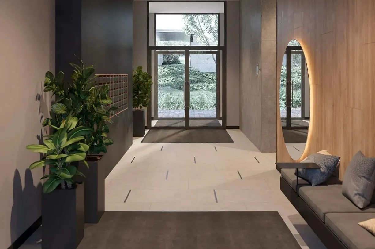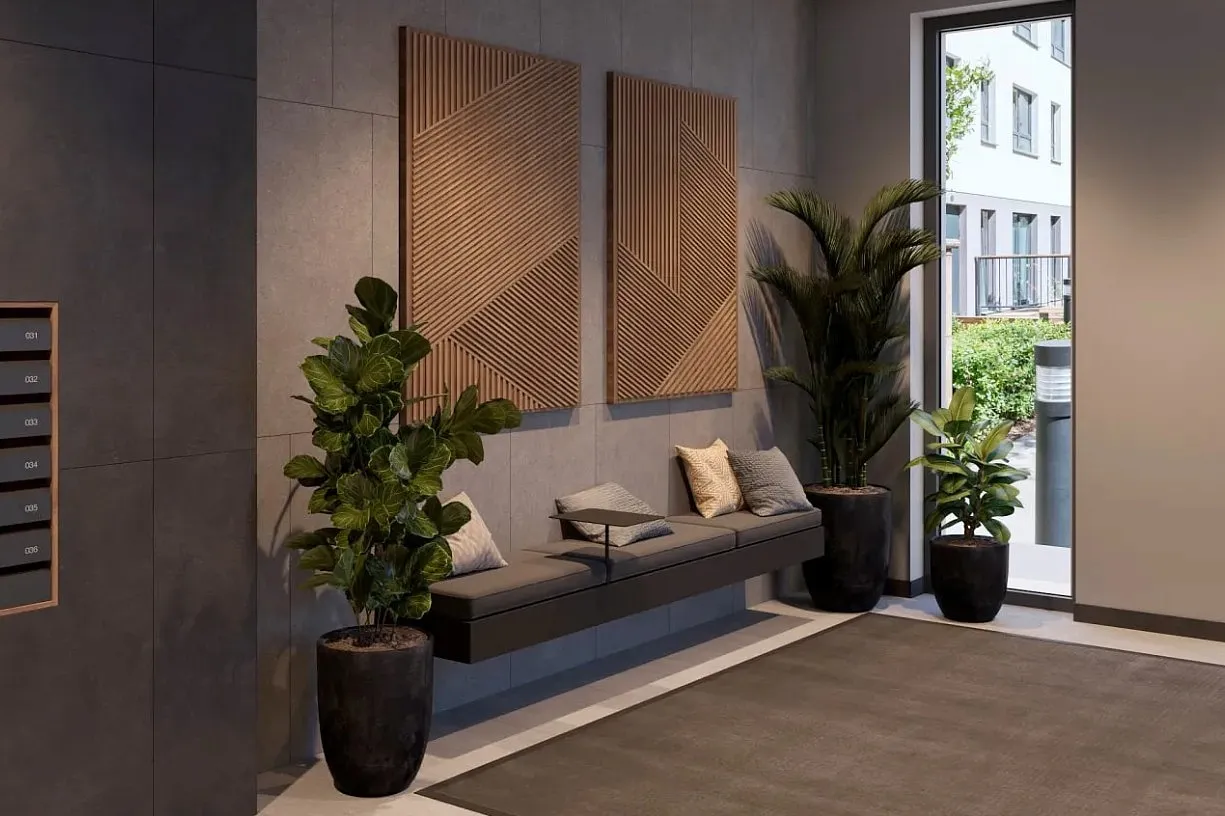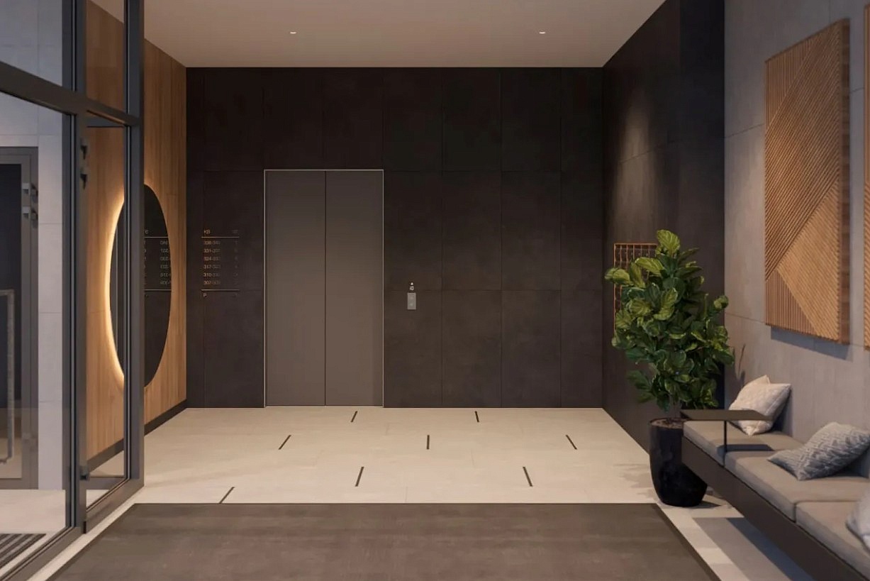 В отделке подъездов используются спокойные природные тона, добавлены мягкие цветовые акценты, тактильные материалы и тёплый рассеянный свет. В холлах есть кресла и диваны, зеркала, зелёные растения. Подъезды будут сквозными — можно войти как со стороны улицы, так и из двора. Все входные группы будут прозрачными и расположены на одном уровне с землёй, без ступеней. Домофоны установлены в тёплых тамбурах, вход — по смарт-ключу. Для хранения колясок и велосипедов мы предусмотрены отдельные помещения. Также установлены бесшумные, вместительные лифты.