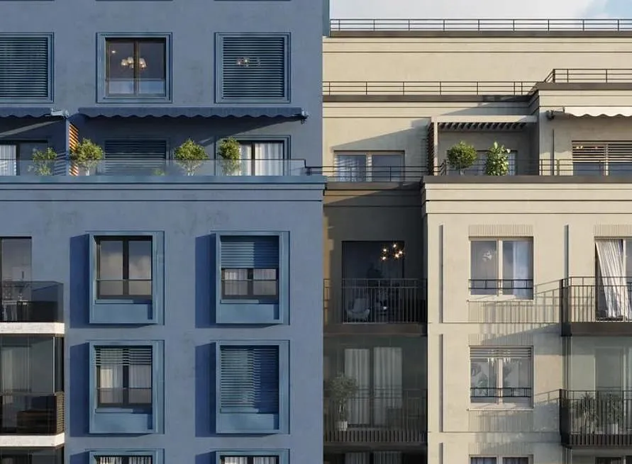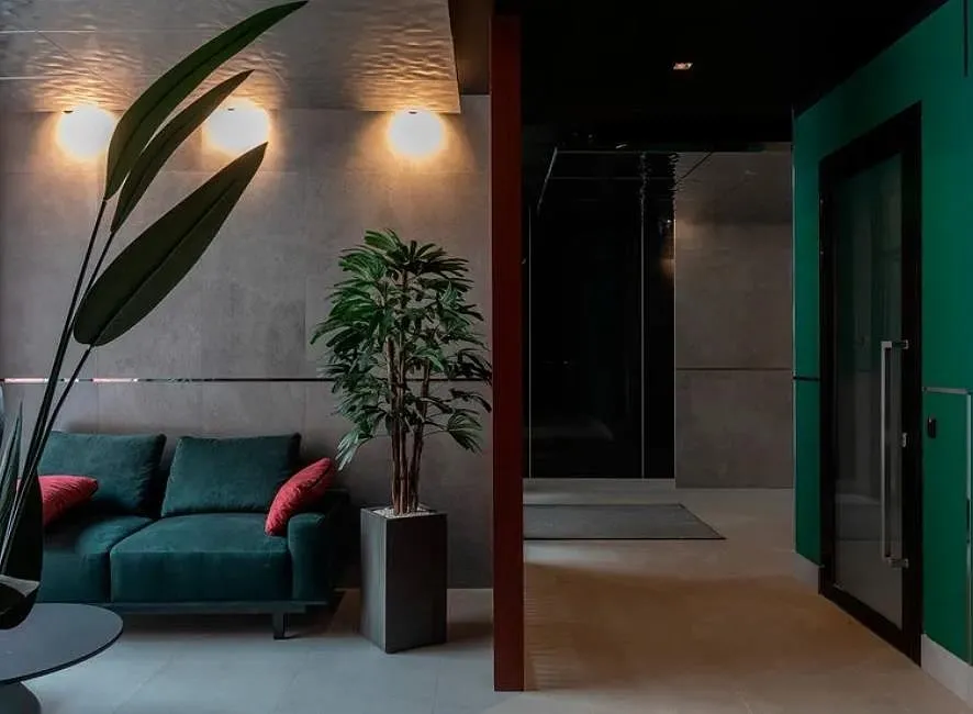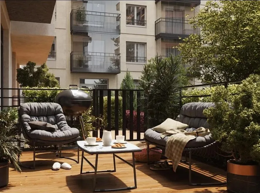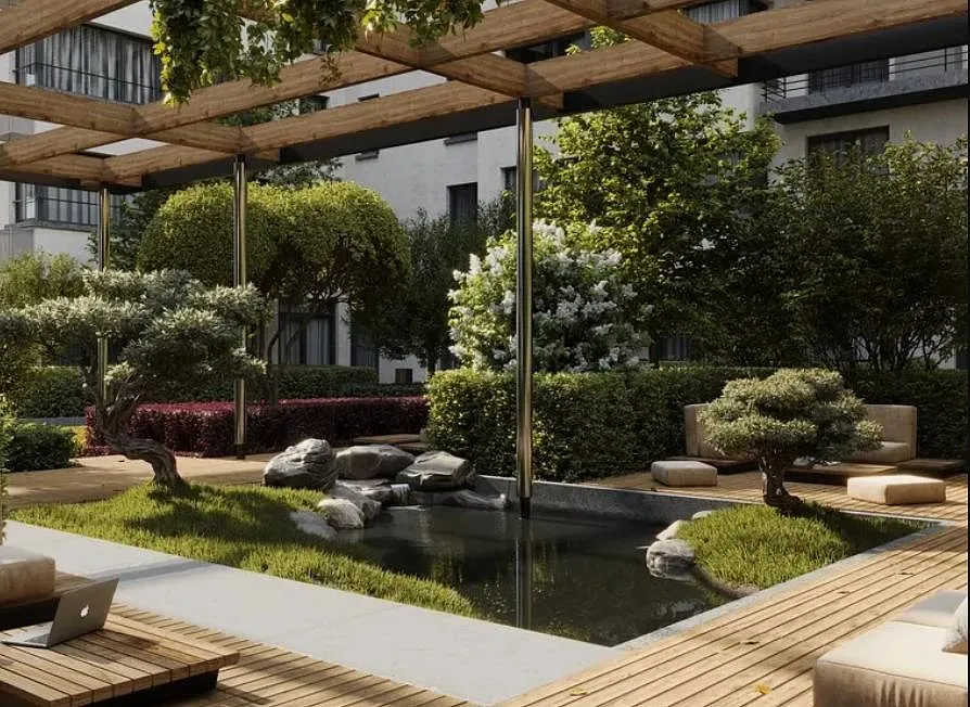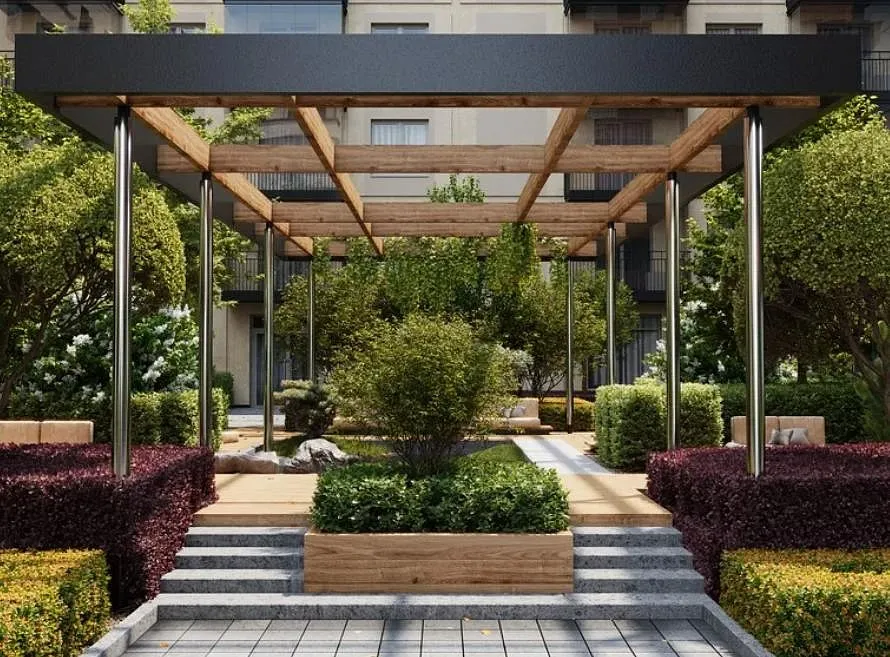 Проект находится в оживлённой части города, поэтому было важно создать приватность — двор поднят на уровень второго этажа и выдержан в стиле японского минимализма: здесь появятся пергола, опоры которой напоминают тории — п-образные ворота синтоистского храма. Под ней — лаунжи с мягкой уличной мебелью и миниатюрный пруд. Находясь в центре мегаполиса жители смогут почувствовать себя на природе.