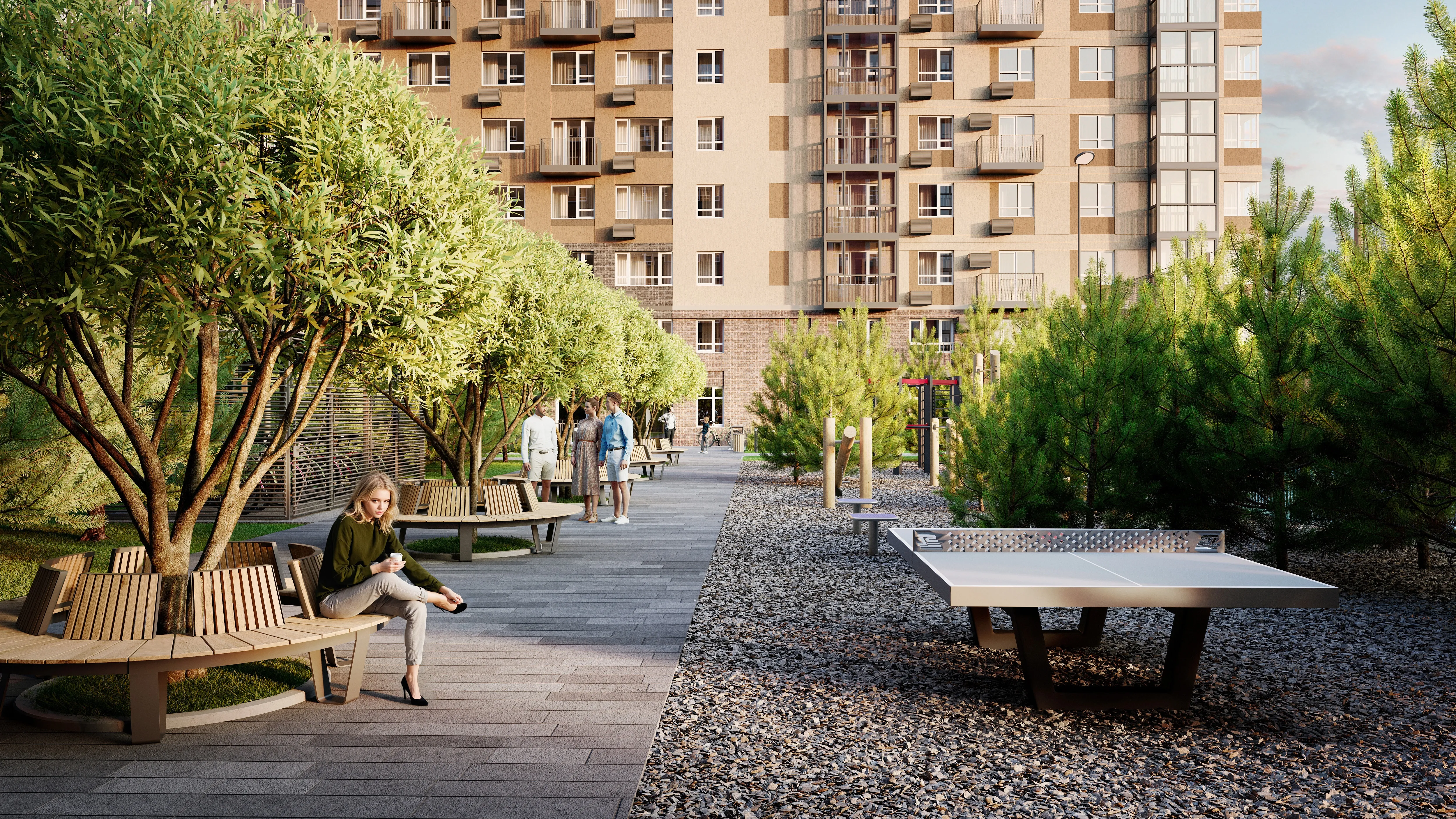 Главная фишка ЖК - свой собственный хвойный сквер прямо во дворе. Территория сквера будет оформлена в минималистичном стиле, главное правило которого сохранение экосистемы и гармоничное встраивание объектов инфраструктуры в природную среду. Здесь будут дорожки из деревянных настилов, зоны отдыха, отель для птиц.