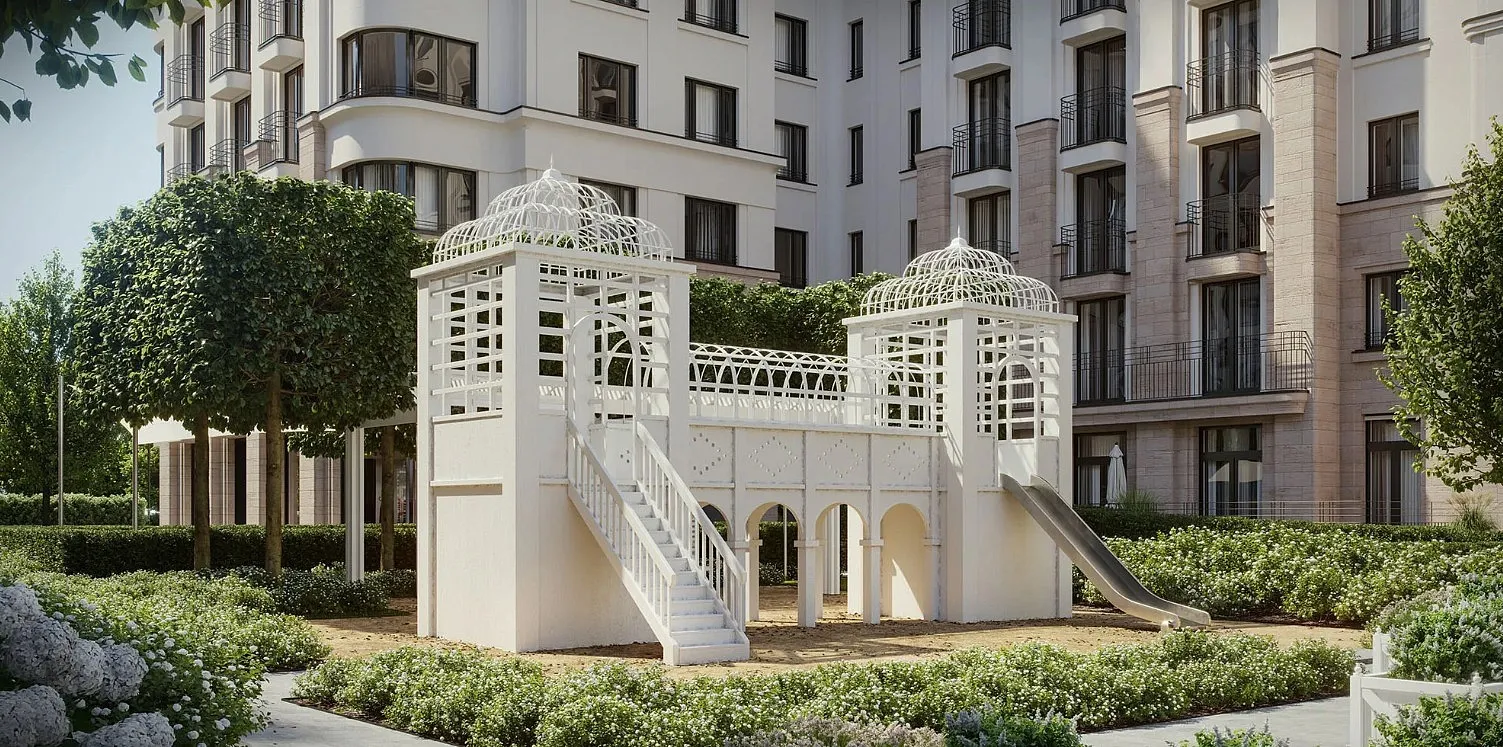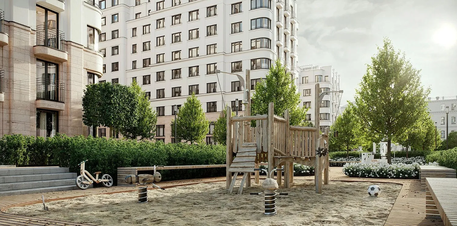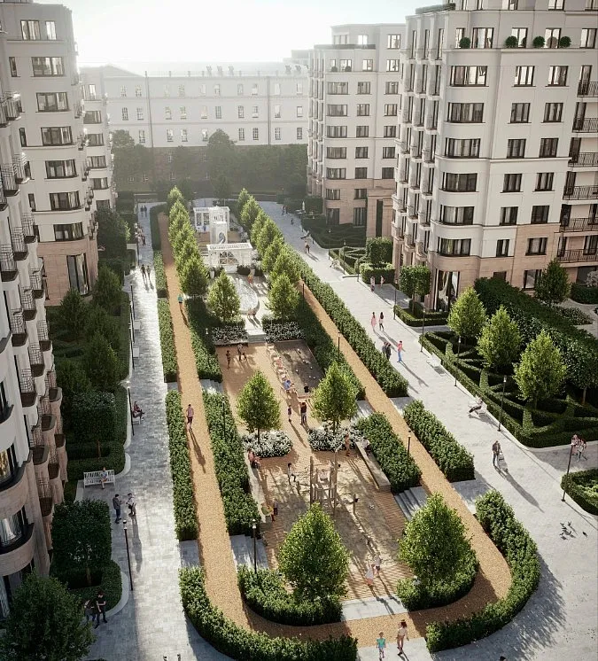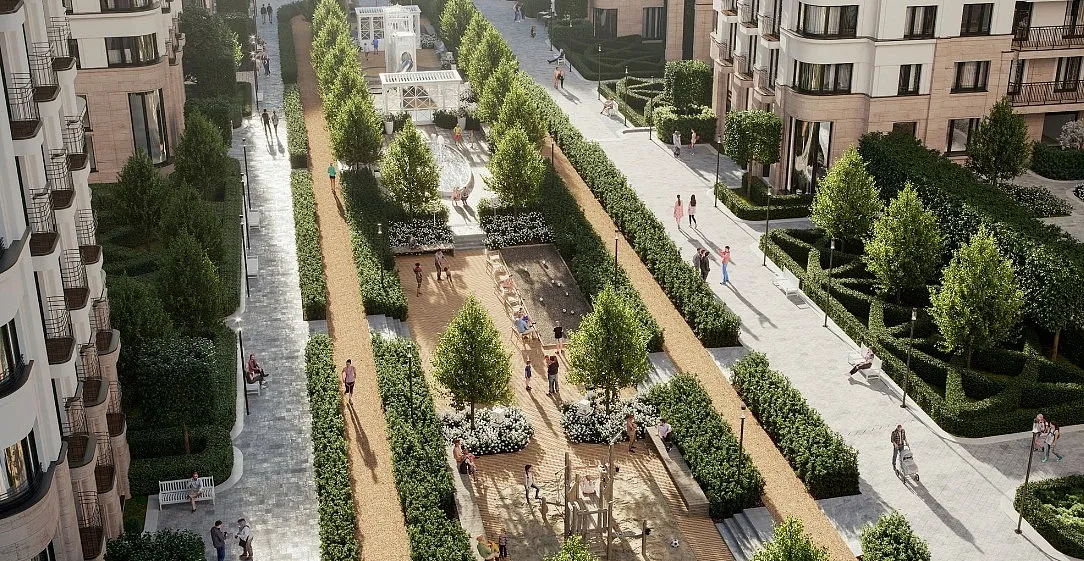 Особенность квартала — общественные пространства и благоустройство нового уровня: городская площадь с фонтаном, центральный пешеходный бульвар, ландшафтный парк, камерные сады и зелёные кровли домов.